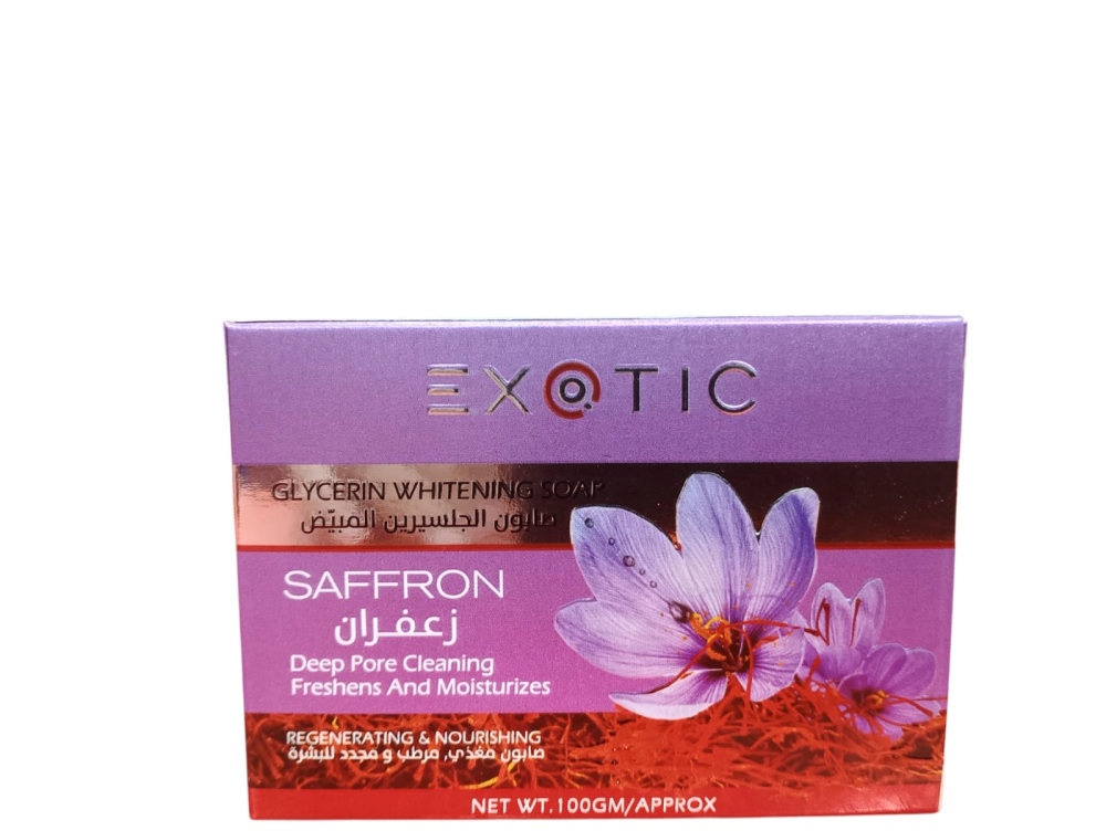 دللي بشرتك مع ايكزوتيك صابون زعفران 100جم، المصمم لتنظيف البشرة بلطف وإزالة الشوائب والزيوت الزائدة. تركيبته الغنية بخلاصة الزعفران الطبيعية تساعد على تفتيح البشرة وتوحيد لونها، مع منحها ملمس ناعم وإشراقة صحية بعد كل استخدام.