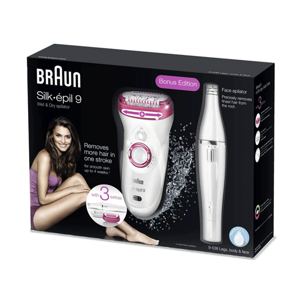 استمتعي ببشرة ناعمة ودائمة النعومة مع Braun Silk‑épil 9 9‑538، الذي يمتاز بتقنية MicroGrip الحديثة التي تلتقط الشعيرات القصيرة جداً (حتى 0.5 مم)، ورأس أوسع بنسبة 40٪ لإزالة عدد أكبر من الشعر في تمريرة واحدة